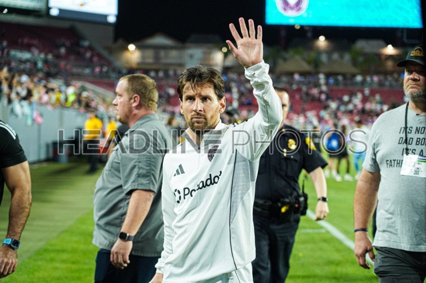 Tampa, Florida, USA, February 14, 2025, Inter Miami players Lionel Messi #10 waving to fans as he heads back to the locker at the end of the match in a friendly Florida Derby Match at Raymond James Stadium. (Photo Credit: Marty Jean-Louis)