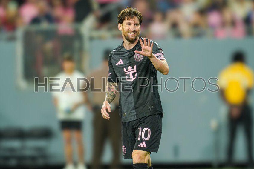 Tampa, Florida, USA, February 14, 2025, Inter Miami players Lionel Messi #10 smiling after a play in a friendly Florida Derby Match at Raymond James Stadium. (Photo Credit: Marty Jean-Louis)