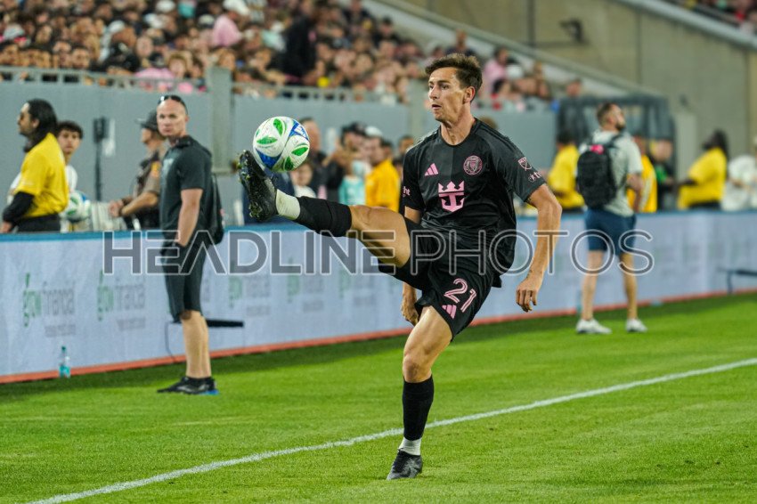 Tampa, Florida, USA, February 14, 2025, Inter Miami forward Tadeo Allende #21 receives a pass in a friendly Florida Derby Match at Raymond James Stadium. (Photo Credit: Marty Jean-Louis)