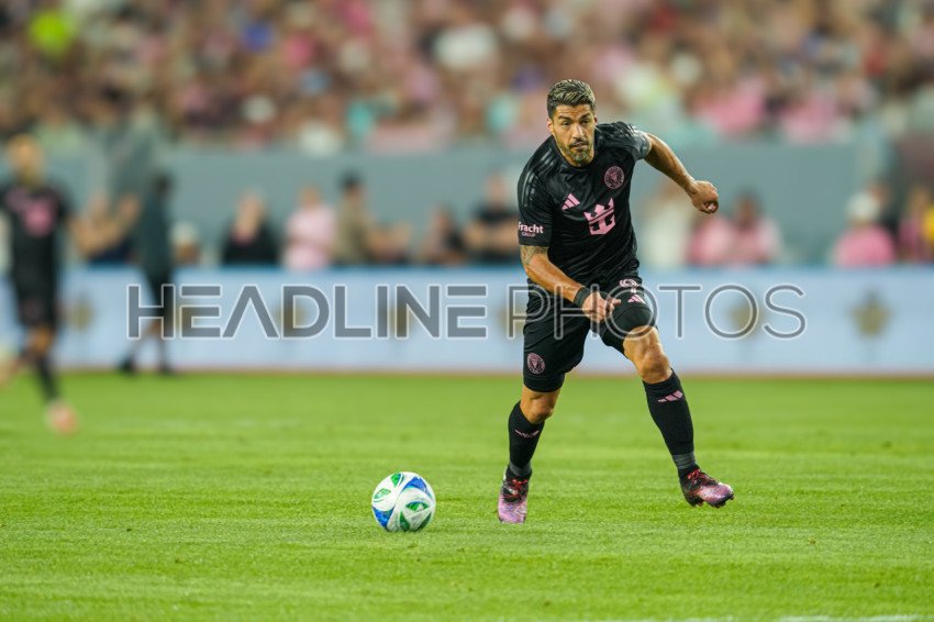 Tampa, Florida, USA, February 14, 2025, Inter Miami forward Luis Suarez #9 runs up field in a friendly Florida Derby Match at Raymond James Stadium. (Photo Credit: Marty Jean-Louis)