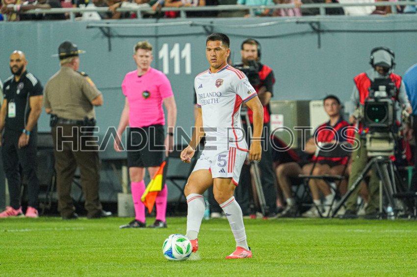 Tampa, Florida, USA, February 14, 2025, Orlando City SC midfielder Cesar Araujo #5 makes a pass in a friendly Florida Derby Match at Raymond James Stadium. (Photo Credit: Marty Jean-Louis)
