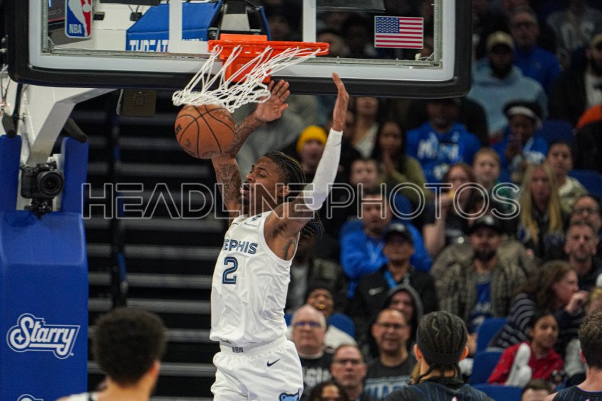Orlando, Florida, USA, February 21, 2025, Memphis Grizzlies guard Ja Morant #12 makes a dunk at the Kia Center. (Photo Credit: Marty Jean-Louis)