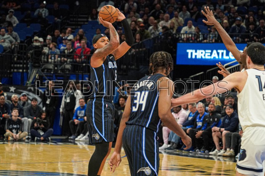 Orlando, Florida, USA, February 21, 2025, Orlando Magic forward Paolo Banchero #5 shoots a three at the Kia Center. (Photo Credit: Marty Jean-Louis)