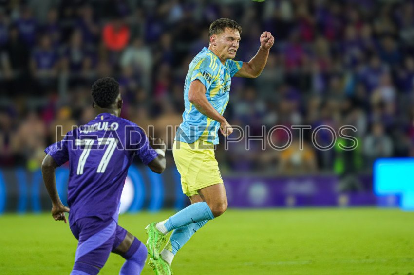Orlando, Florida, USA, February 22, 2025, Philadelphia Union defender Francis Westfield #39 wins the header at Exploria Stadium. (Photo Credit: Marty Jean-Louis)