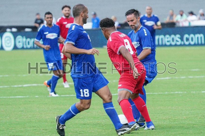 Daytona, Florida, USA, July 2, 2022, Team Americas player Carlos Pavon attempt to run pass Team Europe's players during the Legends Game at the SoccerFest at Daytona Speedway. (Photo Credit: Marty Jean-Louis)
