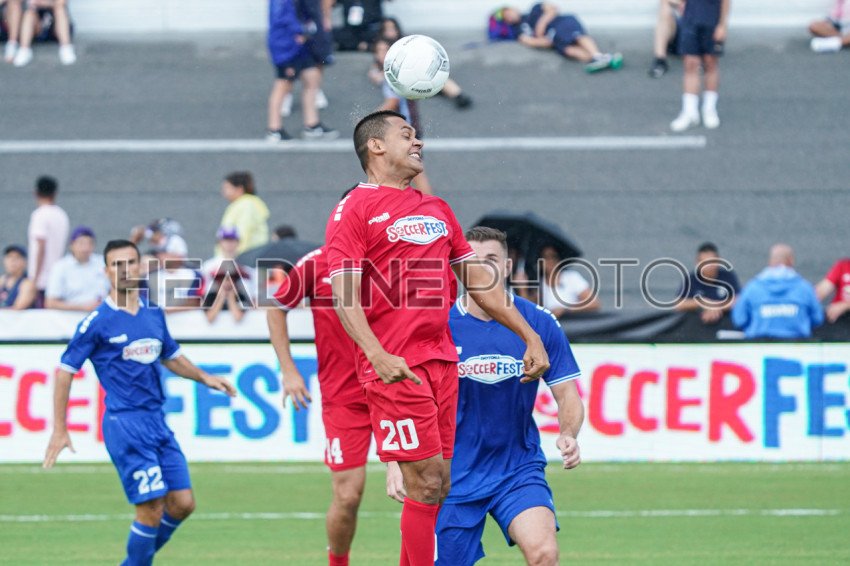 Daytona, Florida, USA, July 2, 2022, Team Americas player Amando :Guevara #20 makes a header during the Legends Game at the SoccerFest at Daytona Speedway. (Photo Credit: Marty Jean-Louis)