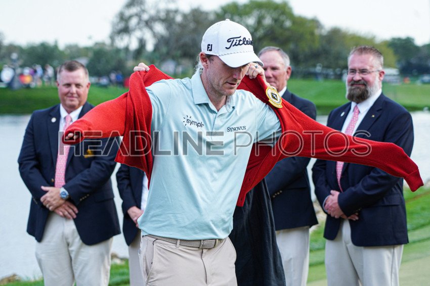 Orlando, Florida, USA, March 9, 2024, Russell Henley wearing the red jacket after winning the 2025 Arnold Palmer Invitational at Bay Hill Club. (Photo Credit: Marty Jean-Louis)