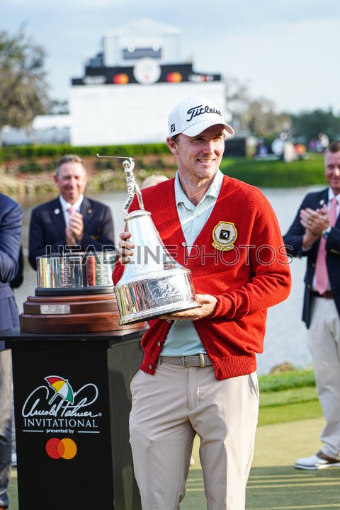 Orlando, Florida, USA, March 9, 2024, Russell Henley holding the trophy after winning the 2025 Arnold Palmer Invitational at Bay Hill Club. (Photo Credit: Marty Jean-Louis)