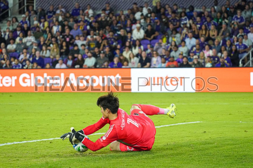 Orlando, Florida, USA, March 22, 2025, DC United goalkeeper Joonhong Kim #1 makes a save at Inter&Co Stadium. (Photo Credit: Marty Jean-Louis)
