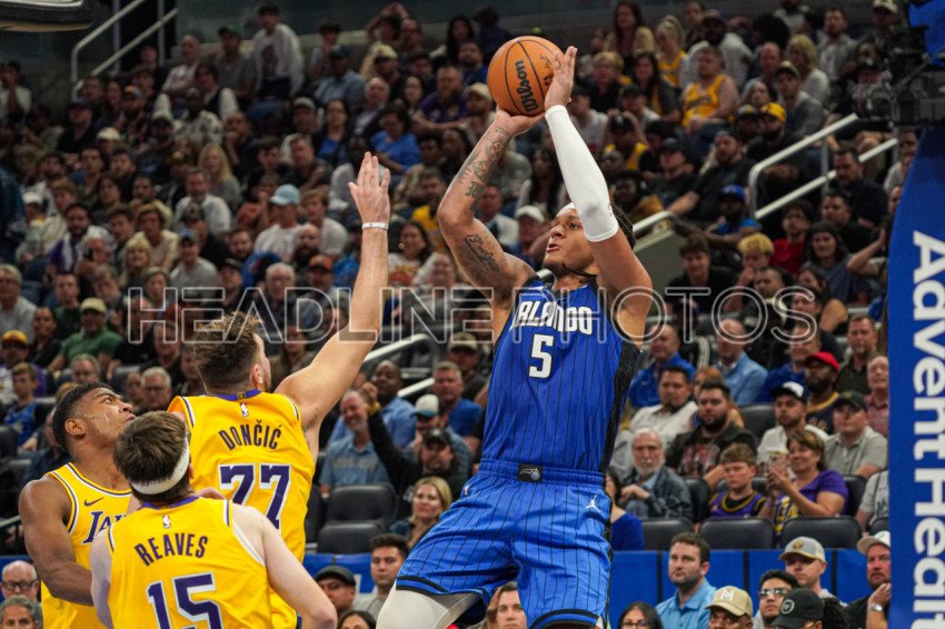 Orlando, Florida, USA, March 24, 2025, Orlando Magic forward Paolo Banchero #5 attempt to score while Luka Doncic #77 tries to block at the Kia Center. (Photo Credit: Marty Jean-Louis)