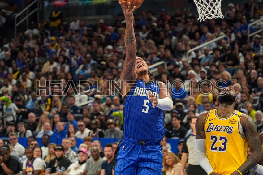Orlando, Florida, USA, March 24, 2025, Orlando Magic forward Paolo Banchero #5 attempt to score while Lebron James watches at the Kia Center. (Photo Credit: Marty Jean-Louis)