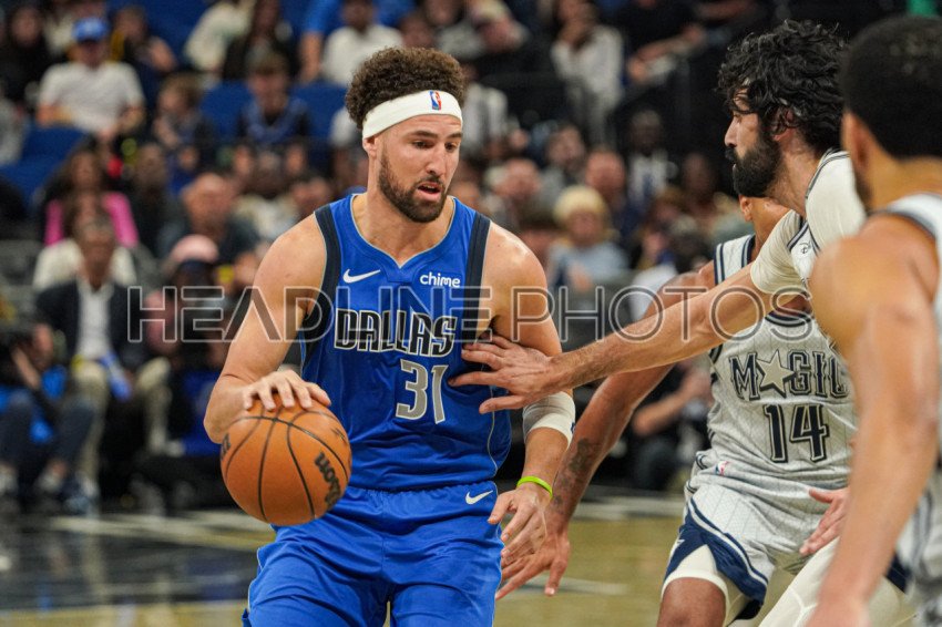 Orlando, Florida, USA, March 27, 2025, Dallas Mavericks guard Klay Thompson #31 rushes pass Gary Harris #14 at the Kia Center. (Photo Credit: Marty Jean-Louis)