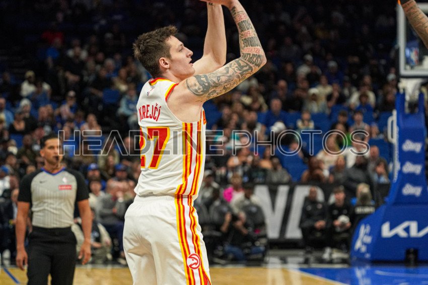 Orlando, Florida, USA, April 8, 2025, Atlanta Hawks forward Vit Krejci #27 shoots a three at the Kia Center. (Photo Credit: Marty Jean-Louis)