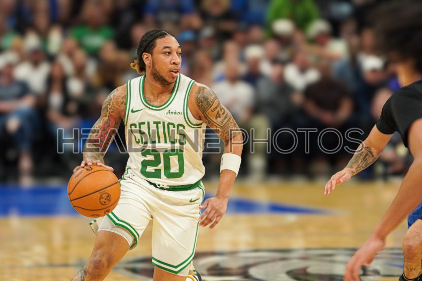 Orlando, Florida, USA, April 9, 2025, Boston Celtics guard JD Davison #20 rushes forward at the Kia Center. (Photo Credit: Marty Jean-Louis)
