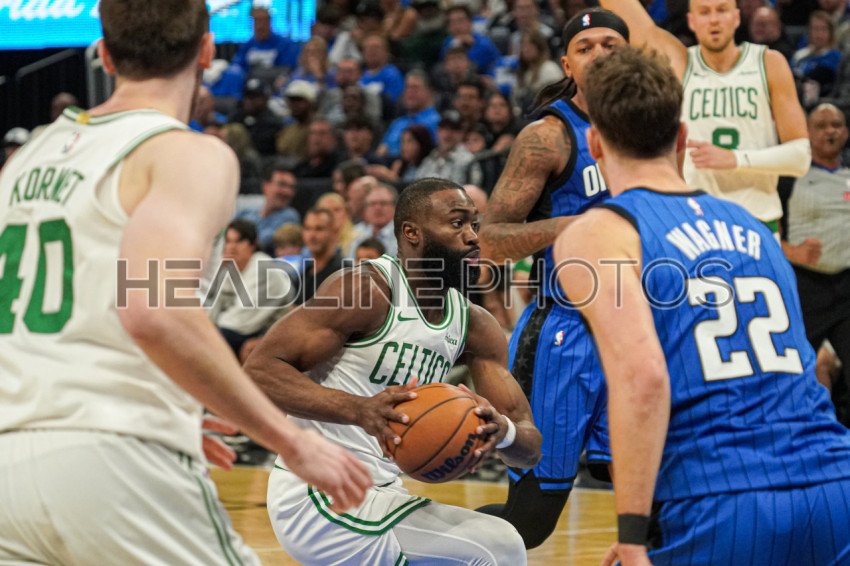 Orlando, Florida, USA, April 25, 2025, Boston Celtics forward Jaylen Brown #7 attempt to run pass Franz Wagner #22 at the Kia Center. (Photo Credit: Marty Jean-Louis)