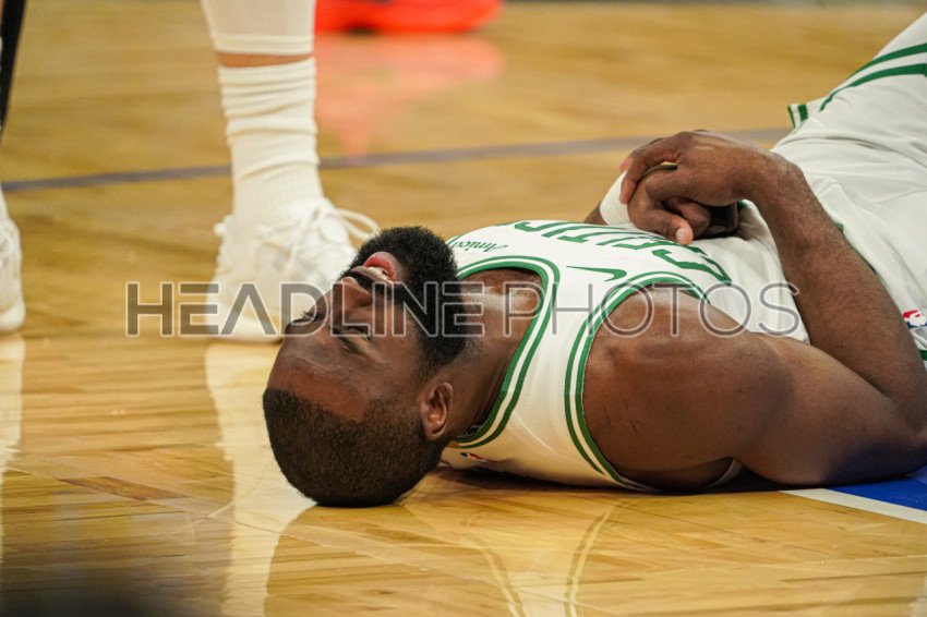 Orlando, Florida, USA, April 25, 2025, Boston Celtics forward Jaylen Brown #7 is on the floor after being fouled at the Kia Center. (Photo Credit: Marty Jean-Louis)