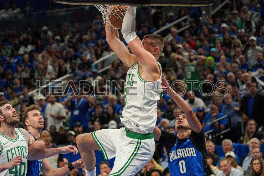 Orlando, Florida, USA, April 25, 2025, Boston Celtics center Kristaps Porzingis #8 makes a dunk at the Kia Center. (Photo Credit: Marty Jean-Louis)