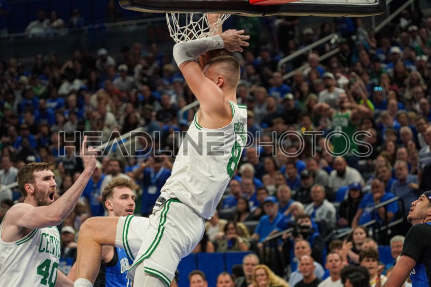 Orlando, Florida, USA, April 25, 2025, Boston Celtics center Kristaps Porzingis #8 makes a dunk at the Kia Center. (Photo Credit: Marty Jean-Louis)
