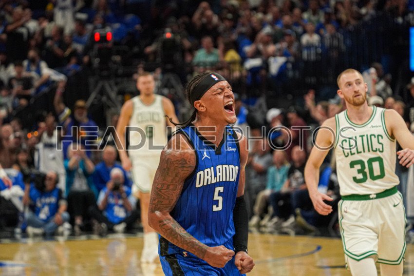 Orlando, Florida, USA, April 25, 2025, Orlando Magic forward Paolo Banchero #5 reacts after making a three at the Kia Center. (Photo Credit: Marty Jean-Louis)