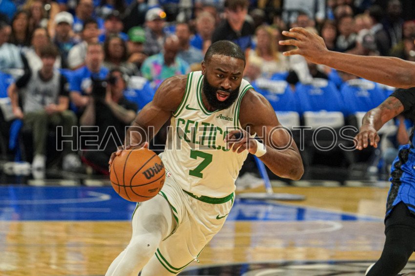 Orlando, Florida, USA, April 25, 2025, Boston Celtics forward Jaylen Brown #7 rushes forward at the Kia Center. (Photo Credit: Marty Jean-Louis)
