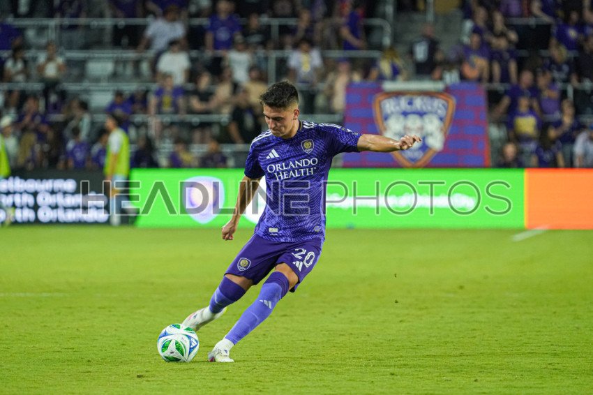 Orlando, Florida, USA, April 26, 2025, Orlando City SC player Eduard Atuesta #20 makes a kick at Inter&Co Stadium. (Photo Credit: Marty Jean-Louis)