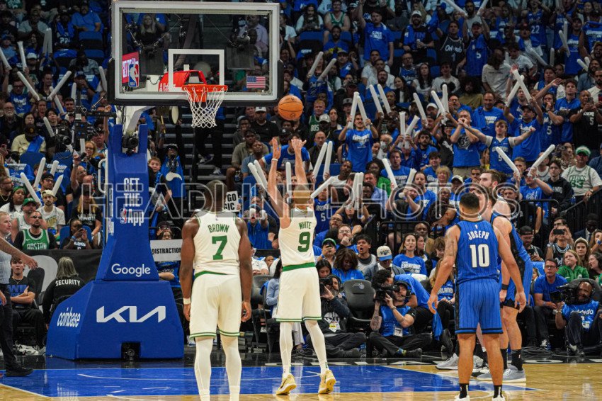Orlando, Florida, USA, April 27, 2025, Boston Celtics player Derrick White #9 shoots a free throw at the Kia Center. (Photo Credit: Marty Jean-Louis)