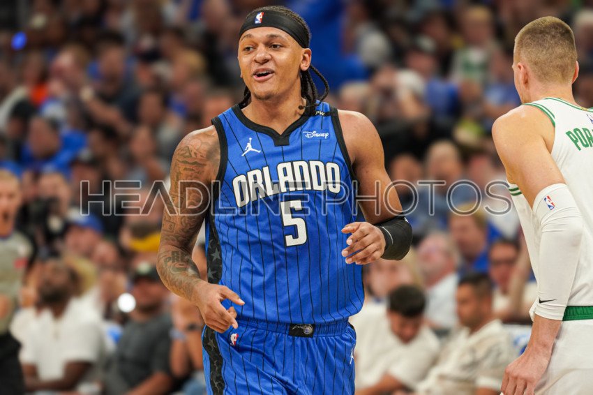 Orlando, Florida, USA, April 27, 2025, Orlando Magic guard Paolo Banchero #5 reacts after making a three at the Kia Center. (Photo Credit: Marty Jean-Louis)