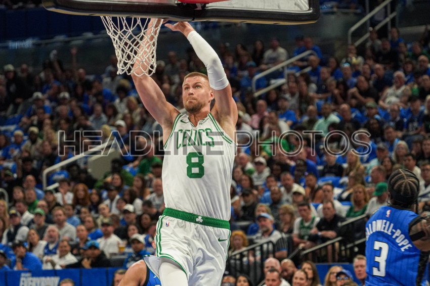 Orlando, Florida, USA, April 27, 2025, Boston Celtics center Kristaps Porzingis #8 makes a dunk at the Kia Center. (Photo Credit: Marty Jean-Louis)