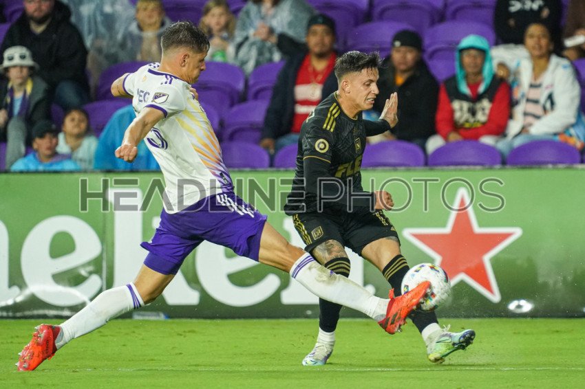 Orlando, Florida, USA, April 2, 2022, LAFC forward Brian Rodriguez #17 atttempt to make a pass but is blocked by defender Rodrigo Schlegel #15 in the second half Orlando City SC at Exploria Stadium. (Photo Credit: Marty Jean-Louis)