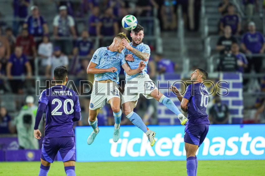 Orlando, Florida, USA, July 16, 2025, New York City FC players Strajinja Tanasijevic #19 and Aiden O'Neill #21 go for the header at Inter&Co Stadium. (Photo Credit: Marty Jean-Louis)