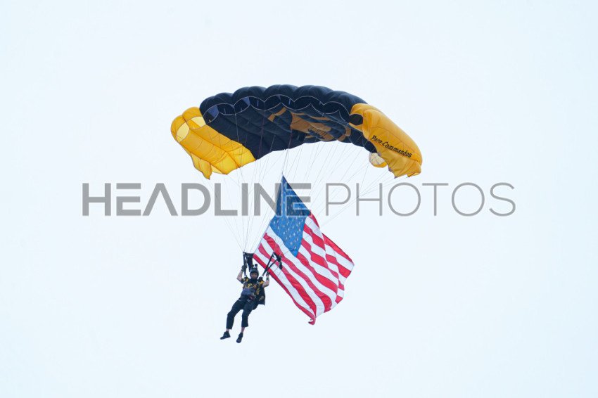 Tampa Bay, Florida, USA, August 23, 2025, parachute with American Flag before the Buffalo Bills vs Tampa Bay Buccaneers game at Raymond James Stadium. (Photo Credit: Marty Jean-Louis)