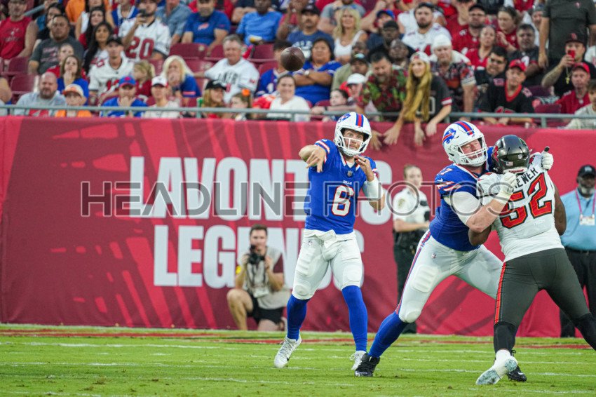 Tampa Bay, Florida, USA, August 23, 2025, Buffalo Bills quarterback Shane Buechele #6 at Raymond James Stadium. (Photo Credit: Marty Jean-Louis)