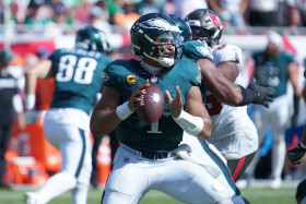 Tampa Bay, Florida, USA, September 28, 2025, Philadelphia Eagles quarterback Jalen Hurts #1 makes a pass at Raymond James Stadium. (Photo Credit: Marty Jean-Louis)