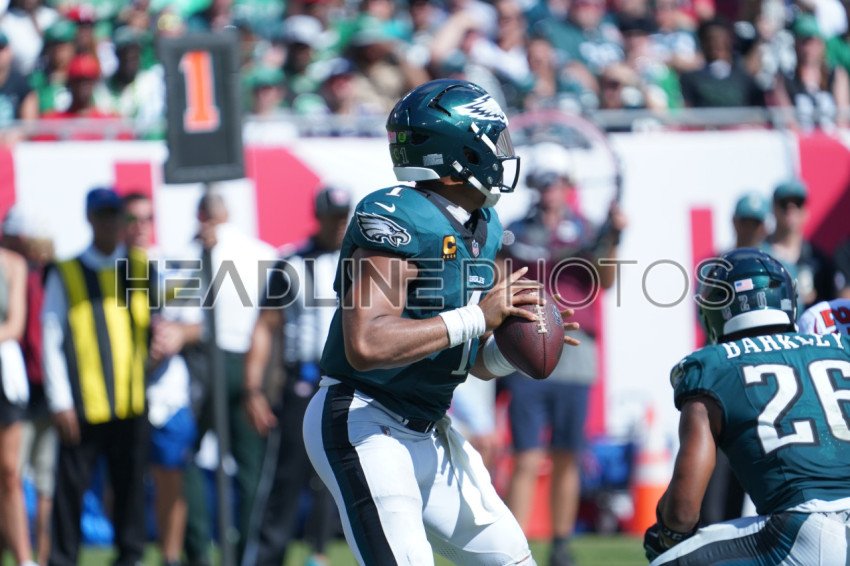 Tampa Bay, Florida, USA, September 28, 2025, Philadelphia Eagles quarterback Jalen Hurts #1 makes a pass at Raymond James Stadium. (Photo Credit: Marty Jean-Louis)