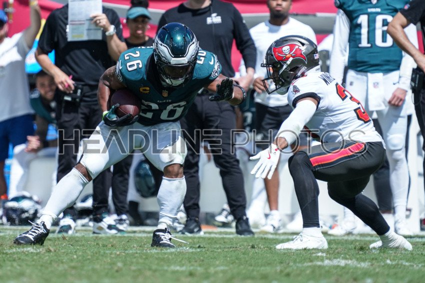 Tampa Bay, Florida, USA, September 28, 2025, Philadelphia Eagles running back Saquon Barkley #26 attempt to escape at Raymond James Stadium. (Photo Credit: Marty Jean-Louis)