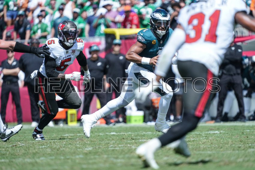 Tampa Bay, Florida, USA, September 28, 2025, Philadelphia Eagles quarterback Jalen Hurts #1 on the run at Raymond James Stadium. (Photo Credit: Marty Jean-Louis)