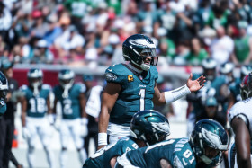 Tampa Bay, Florida, USA, September 28, 2025, Philadelphia Eagles quarterback Jalen Hurts #1 on the run at Raymond James Stadium. (Photo Credit: Marty Jean-Louis)