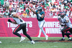 Tampa Bay, Florida, USA, September 28, 2025, Philadelphia Eagles quarterback Jalen Hurts #1 makes a pass at Raymond James Stadium. (Photo Credit: Marty Jean-Louis)