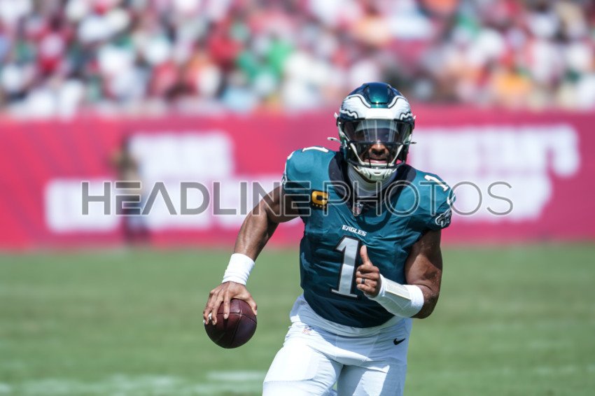 Tampa Bay, Florida, USA, September 28, 2025, Philadelphia Eagles quarterback Jalen Hurts #1 on the run at Raymond James Stadium. (Photo Credit: Marty Jean-Louis)