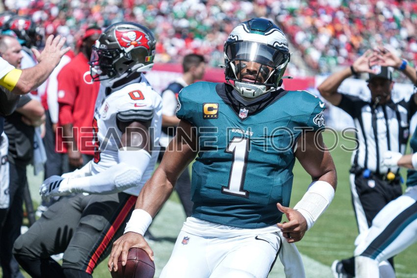 Tampa Bay, Florida, USA, September 28, 2025, Philadelphia Eagles quarterback Jalen Hurts #1 on the run at Raymond James Stadium. (Photo Credit: Marty Jean-Louis)