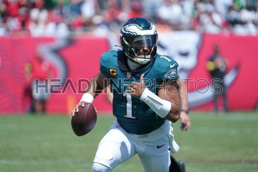 Tampa Bay, Florida, USA, September 28, 2025, Philadelphia Eagles quarterback Jalen Hurts #1 on the run at Raymond James Stadium. (Photo Credit: Marty Jean-Louis)