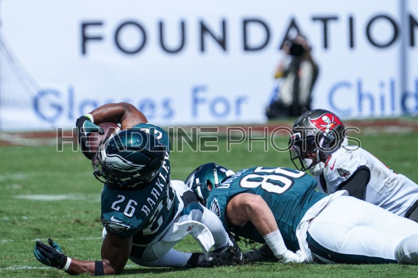 Tampa Bay, Florida, USA, September 28, 2025, Philadelphia Eagles running back Saquon Barkley #26 gets tackled at Raymond James Stadium. (Photo Credit: Marty Jean-Louis)