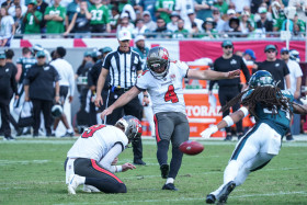 Tampa Bay, Florida, USA, September 28, 2025, Tampa Bay Buccaneers kicker Chase McLaughlin #4 makes a kick at Raymond James Stadium. (Photo Credit: Marty Jean-Louis)