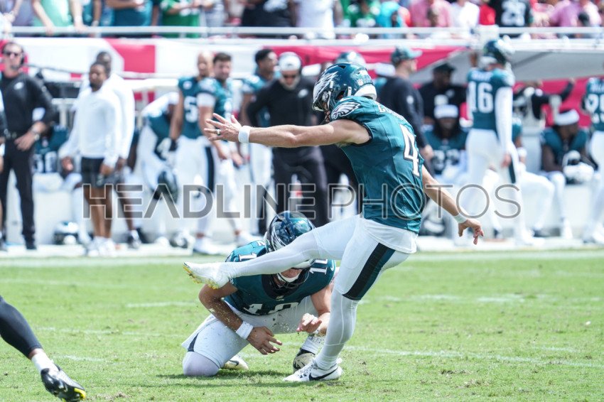Tampa Bay, Florida, USA, September 28, 2025, Philadelphia Eagles kicker Jake Elliott #4 makes a kick at Raymond James Stadium. (Photo Credit: Marty Jean-Louis)