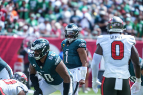Tampa Bay, Florida, USA, September 28, 2025, Philadelphia Eagles quarterback Jalen Hurts #1 at Raymond James Stadium. (Photo Credit: Marty Jean-Louis)