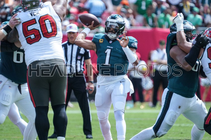Tampa Bay, Florida, USA, September 28, 2025, Philadelphia Eagles quarterback Jalen Hurts #1 makes a pass at Raymond James Stadium. (Photo Credit: Marty Jean-Louis)