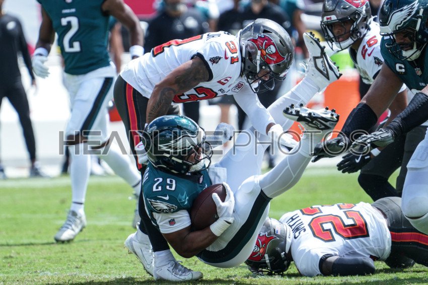 Tampa Bay, Florida, USA, September 28, 2025, Philadelphia Eagles palyer AJ Dillon #29 gets tackled at Raymond James Stadium. (Photo Credit: Marty Jean-Louis)