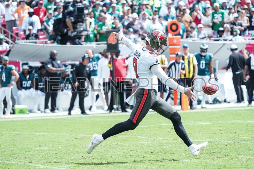 Tampa Bay, Florida, USA, September 28, 2025, Tampa Bay Buccaneers Punter Riley Dixon #9 makes a punt at Raymond James Stadium. (Photo Credit: Marty Jean-Louis)