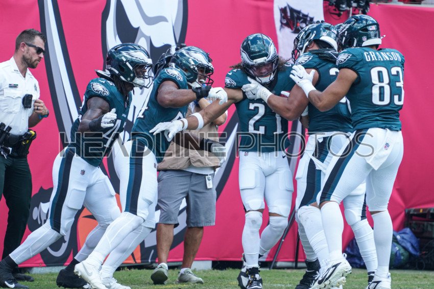 Tampa Bay, Florida, USA, September 28, 2025, Philadelphia Eagles safety Sydney Brown #21 with teammates celebrate a touchdown at Raymond James Stadium. (Photo Credit: Marty Jean-Louis)