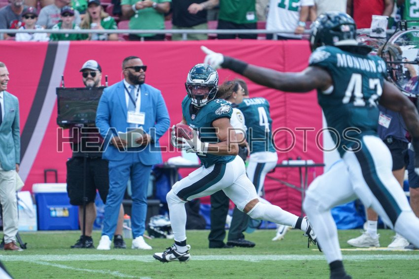 Tampa Bay, Florida, USA, September 28, 2025, Philadelphia Eagles safety Sydney Brown #21 runs to make a touchdown at Raymond James Stadium. (Photo Credit: Marty Jean-Louis)